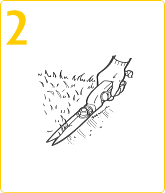 | まず、芝生の周囲や、堀、庭石、立ち木のキワなど、芝刈り機で刈れないところを「芝生ばさみ」で刈り込みます。 |